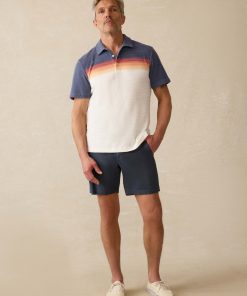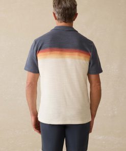 - Detail: Relaxed collar. Three-button placket. Short sleeves. Top applied chest stripes. Vented hem. Locker loop main label. Sun & Waves label at wearer’s left hem.