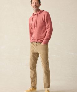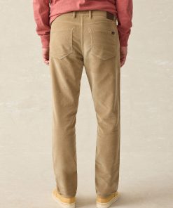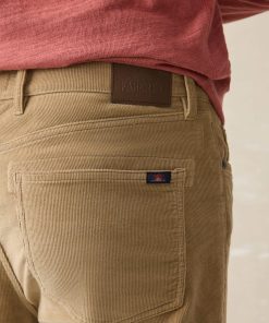 - Detail: Belt loops. Classic 5-pocket styling. Metal Rivets for pocket reinforcements. Metal fly zipper. Faherty logo back patch at wearer’s right.