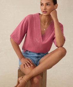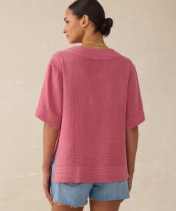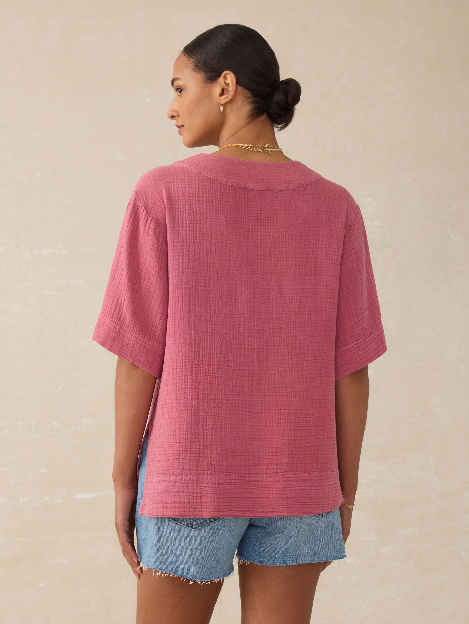 This top effortlessly combines relaxed ease with thoughtful tailoring, making it a versatile staple for any occasion. Crafted from soft and airy 100% organic double gauze cotton, it feels like a fresh start—light, breathable, and ready for sunnier days ahead.