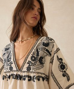 - Detail: Functional ties at shoulders, with encased elastic at waistband.