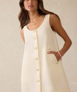 - Detail: Sleeveless linen denim dress. Button front with welt pockets
