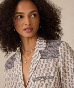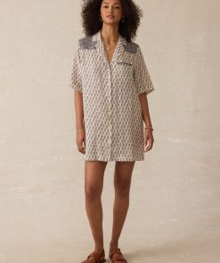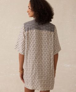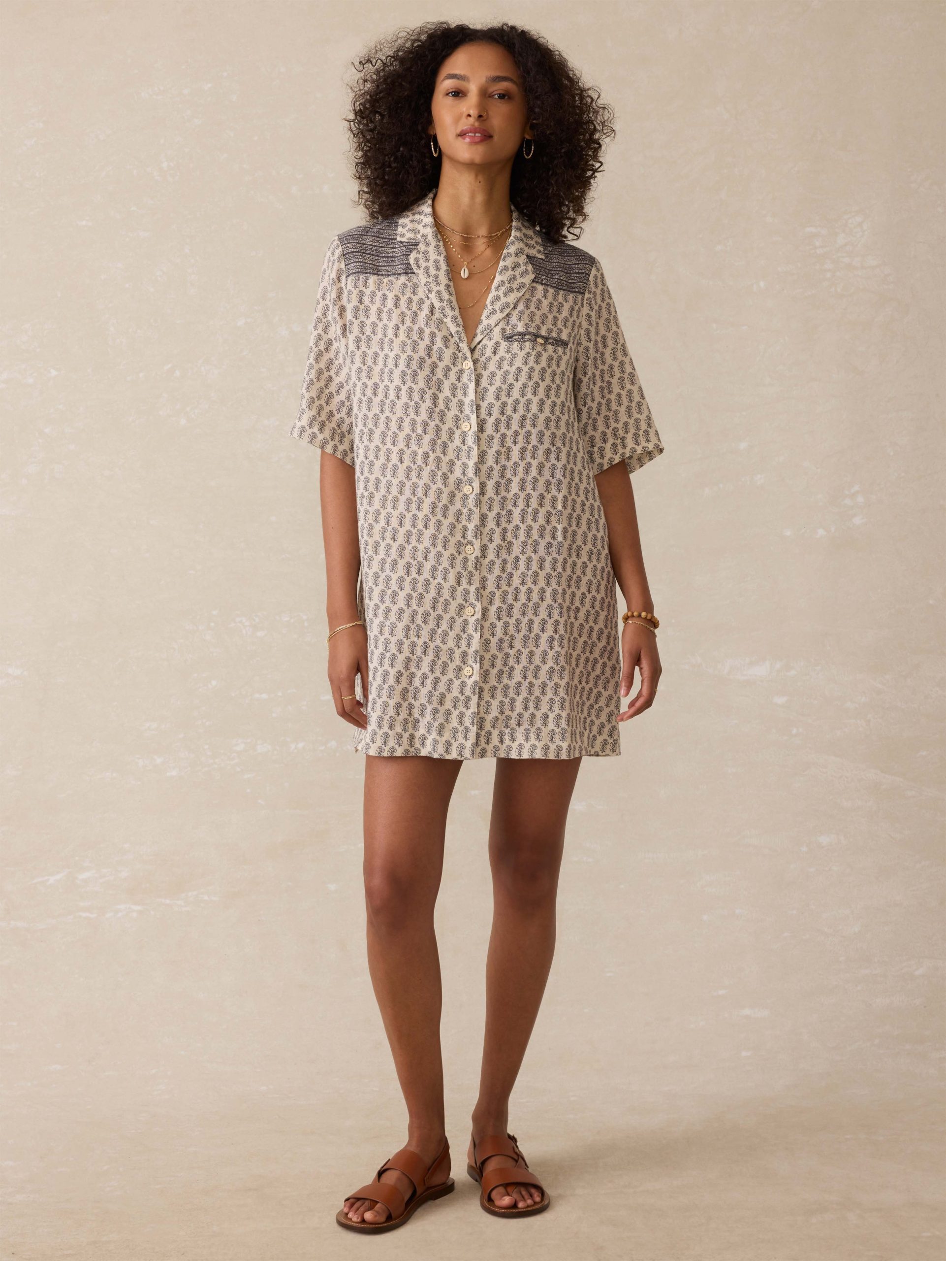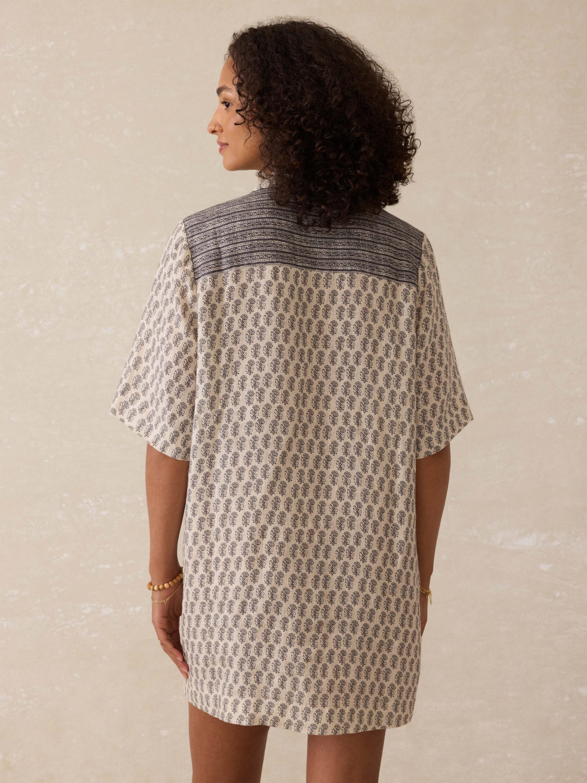 - Detail: Mixed print camp collar dress with coco buttons. Welt pocket at chest with button.