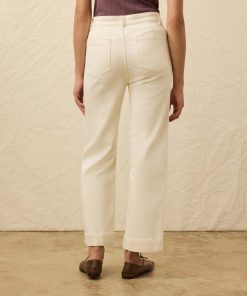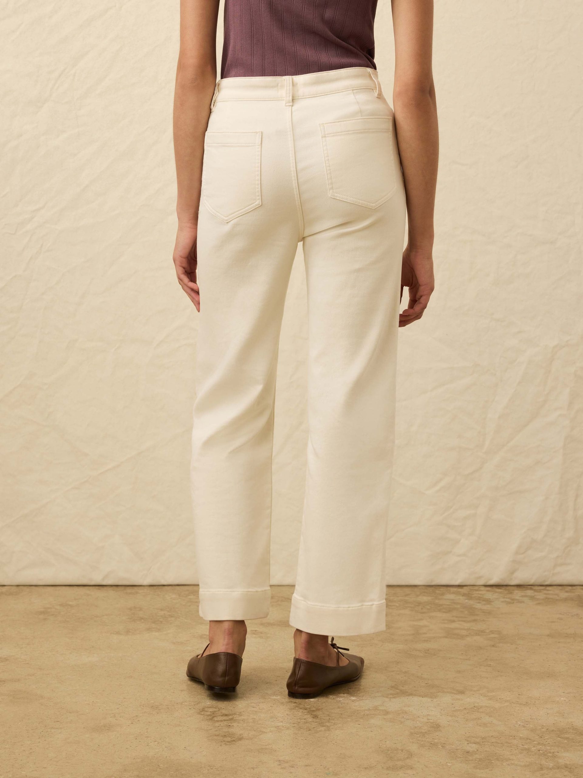 - Detail: Yarn dyed stretch terry slim wide leg pants with patched front and back pockets. Regular stretch. Ankle length