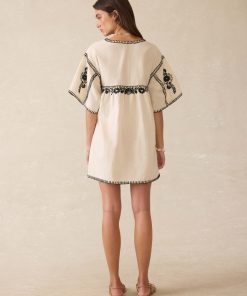 - Detail: V-neck dress with embroidery detailing at front and back, and sleeves. Blanket stitch along seams and hem.