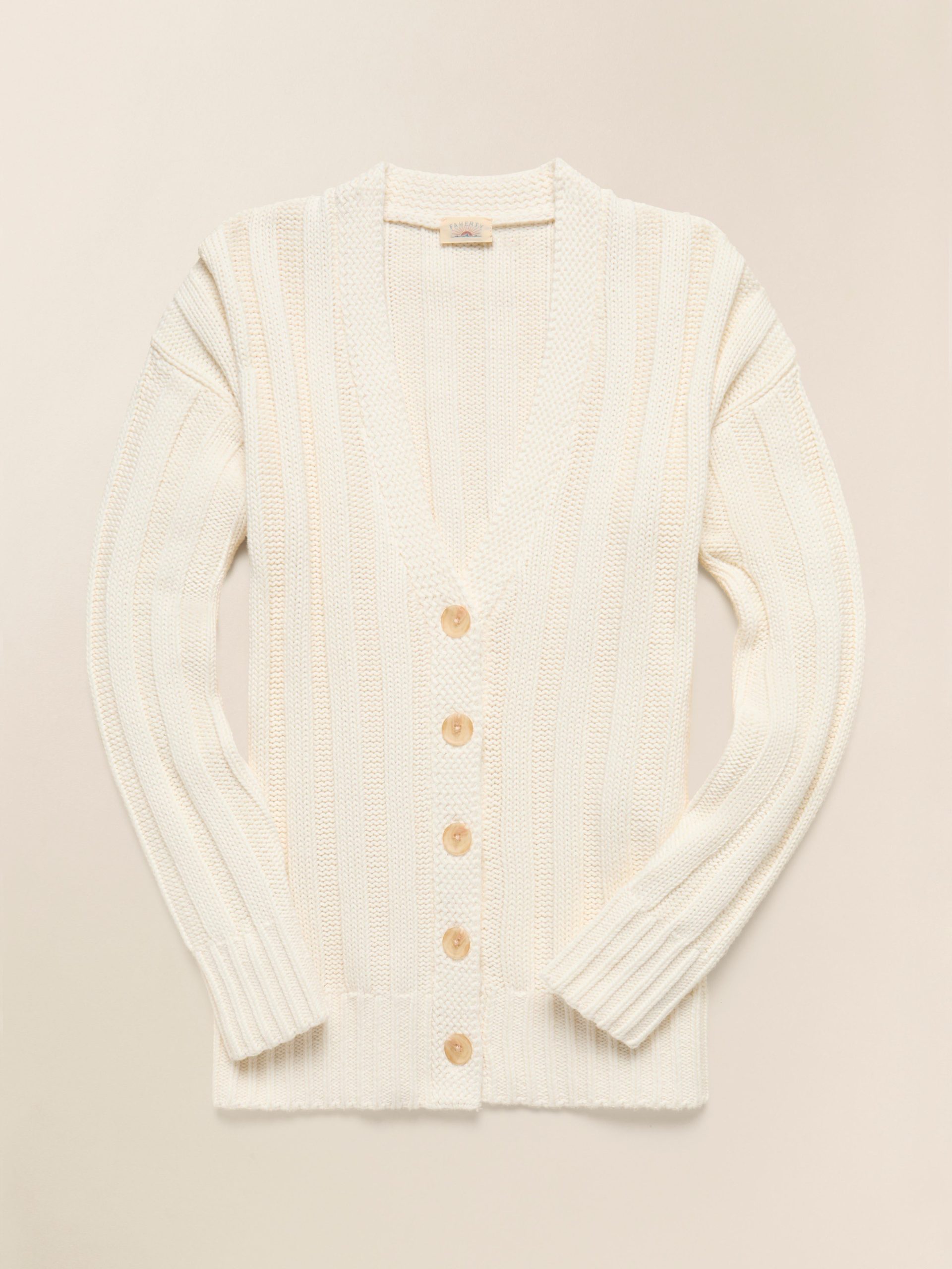 The ultimate throw-on-and-go cardigan. Crafted in a classic fisherman stitch, this chunky knit has the perfect weight—substantial yet airy—making it ideal for layering without feeling heavy. Its relaxed fit and sun-faded hues give it that lived-in character and texture that elevates any outfit.