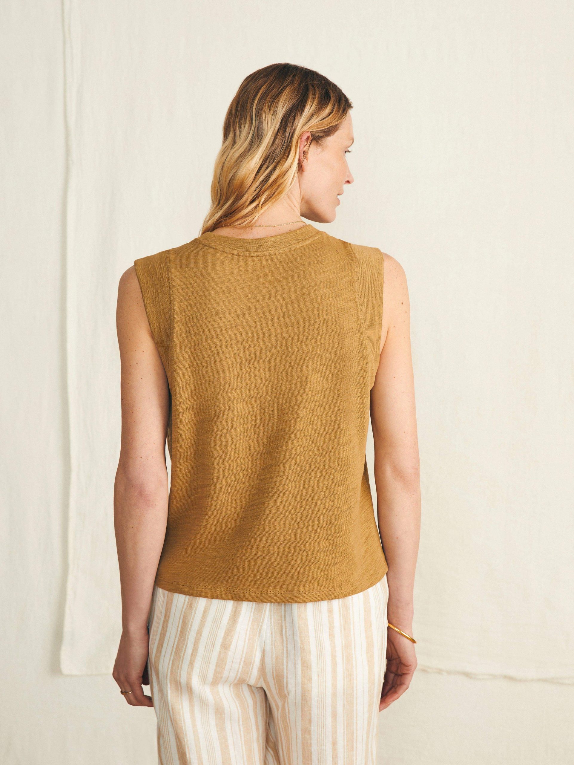 We consider the muscle tank one of summer’s essential tops. In our perfectly faded sunwashed treatment, it strikes a nonchalant and lived-in cool that never goes out of style. The slightly cropped and breezy fit pairs perfectly with any summer short or skirt.